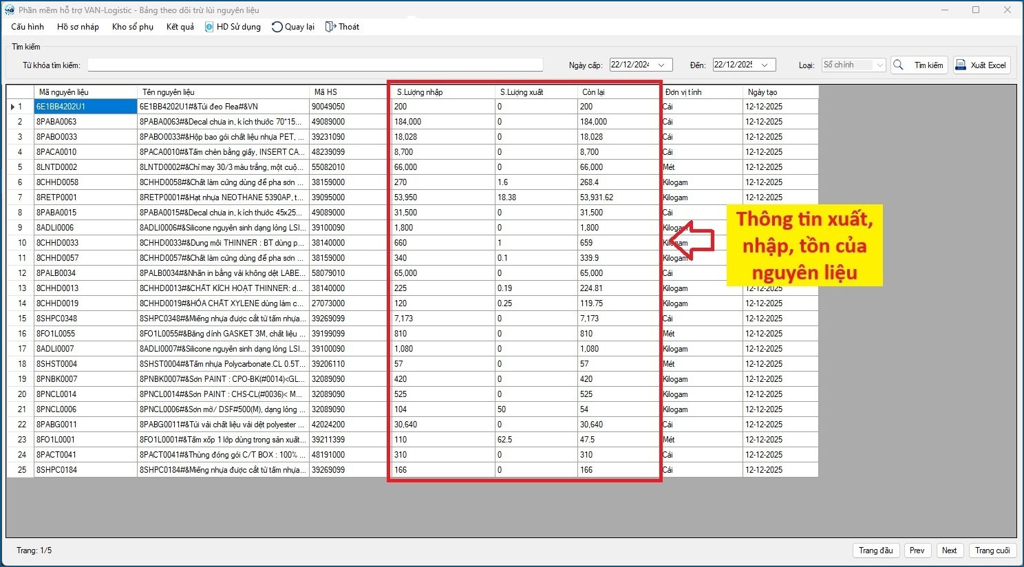 + Tổng nhập, tổng xuất và tồn kho còn lại của nguyên liệu