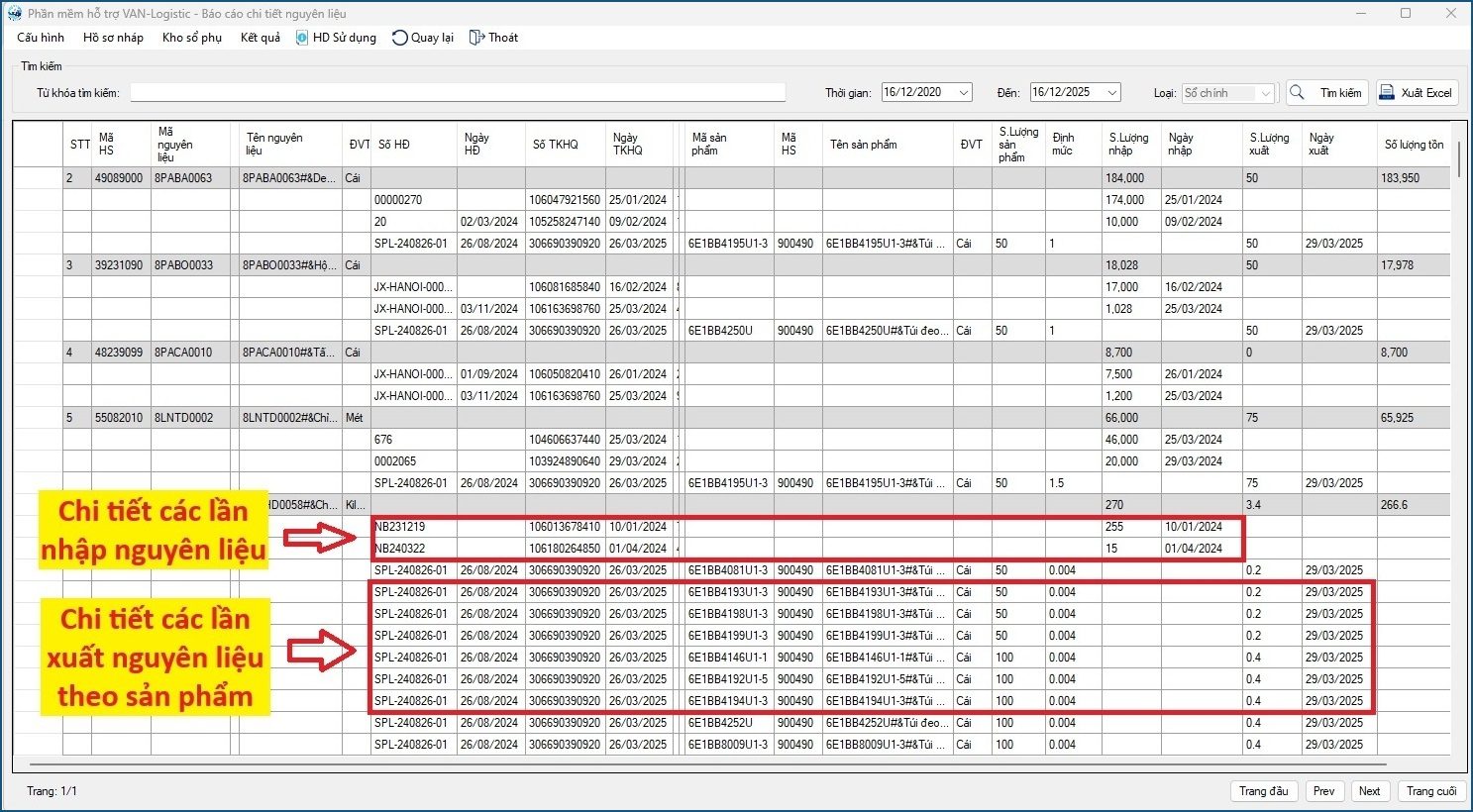 + Chi tiết từng lần xuất hàng: Nguyên liệu xuất theo Sản phẩm nào, định mức và số lượng là bao nhiêu, Số TKHQ/Hóa đơn xuất, ngày xuất kho.