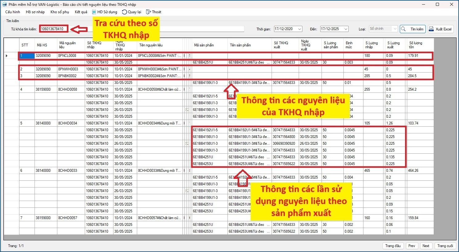 + Thông tin chi tiết của các lần xuất đi của nguyên liệu đó: Số lượng xuất đi, xuất theo Sản phẩm nào, Số TKHQ xuất, tồn kho của nguyên liệu trong số TKHQ nhập.