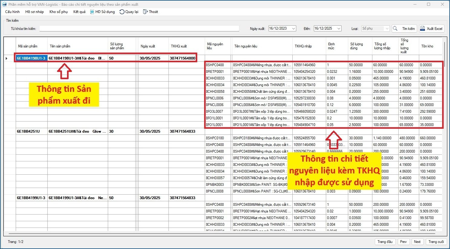 + Chi tiết từng lần xuất hàng: Nguyên liệu xuất theo Sản phẩm nào, định mức và số lượng là bao nhiêu, Số TKHQ/Hóa đơn xuất, ngày xuất kho.