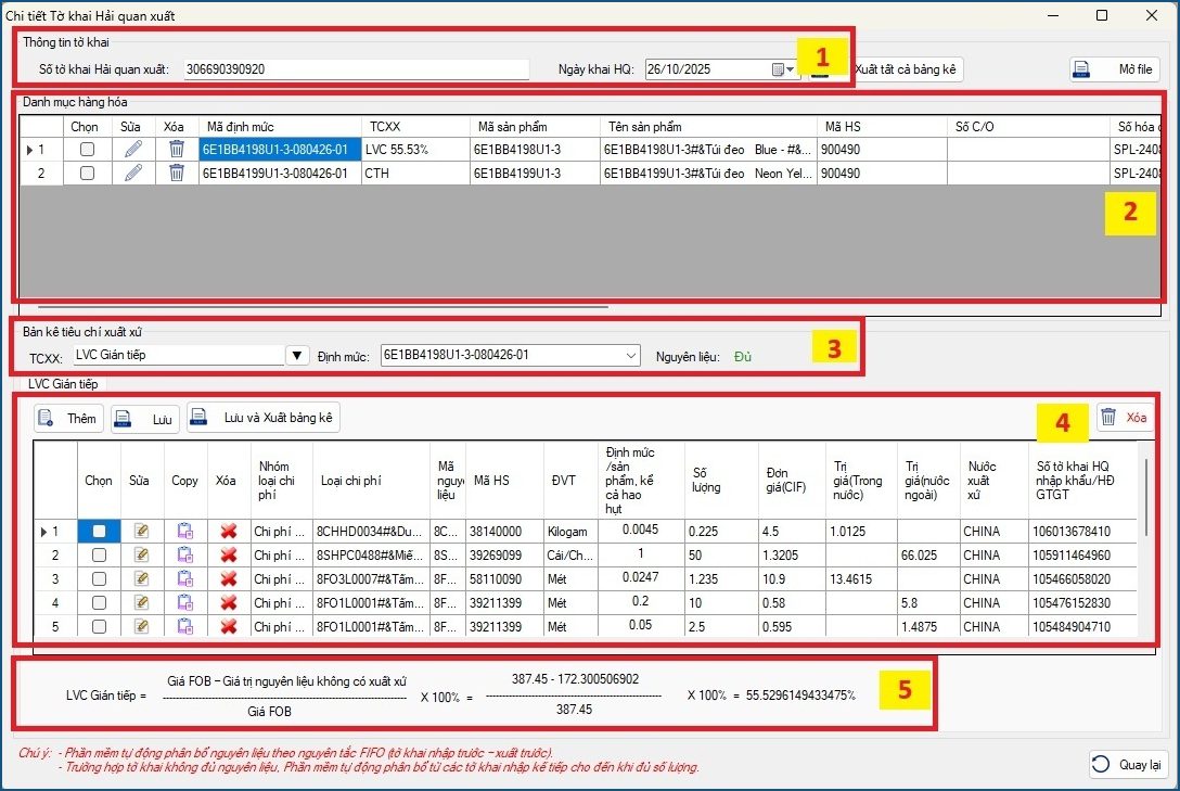 – Khu vực 5: Công thức và kết quả tính Hàm lượng xuất xứ.