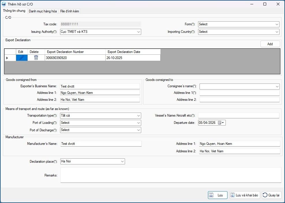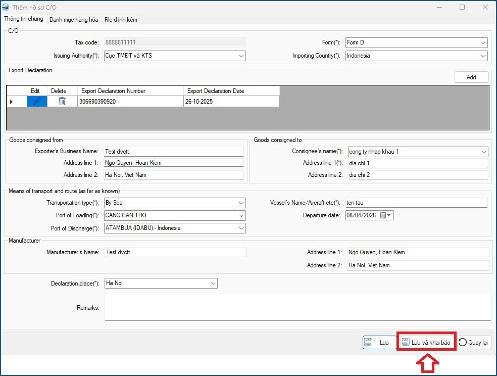 • Sau khi nhập đầy đủ thông tin, Doanh nghiệp chọn “Lưu và khai báo” để gửi hồ sơ tới hệ thống cấp C/O điện tử.
