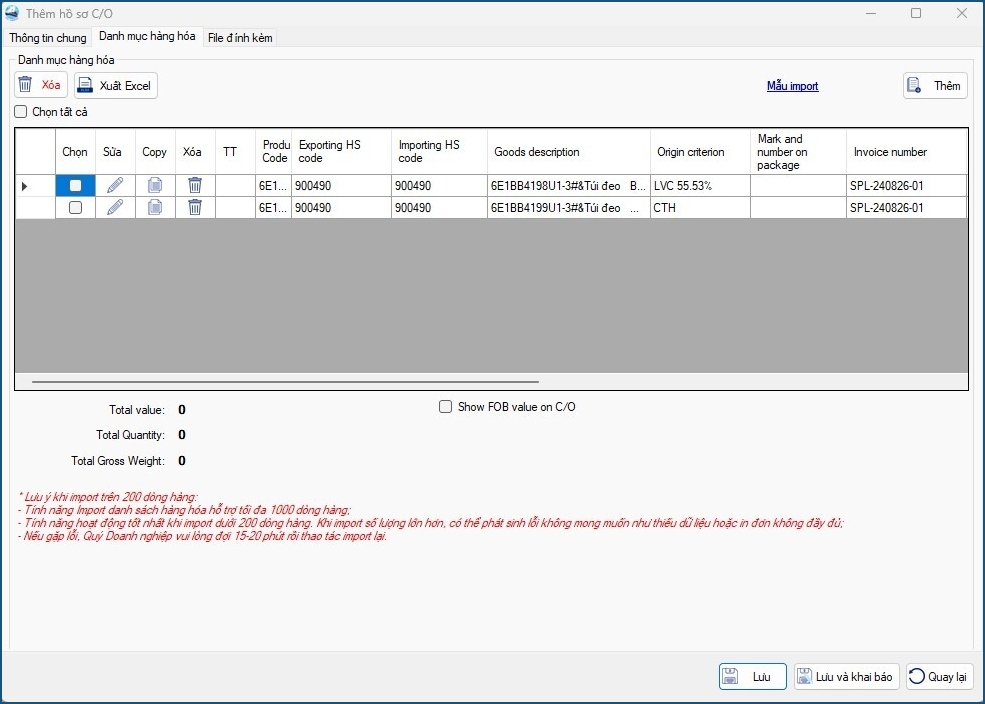 • Danh sách C/O: Tổng hợp các bộ hồ sơ C/O đã tạo từ tính năng Trừ lùi NPL