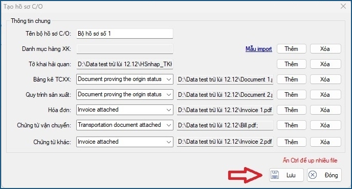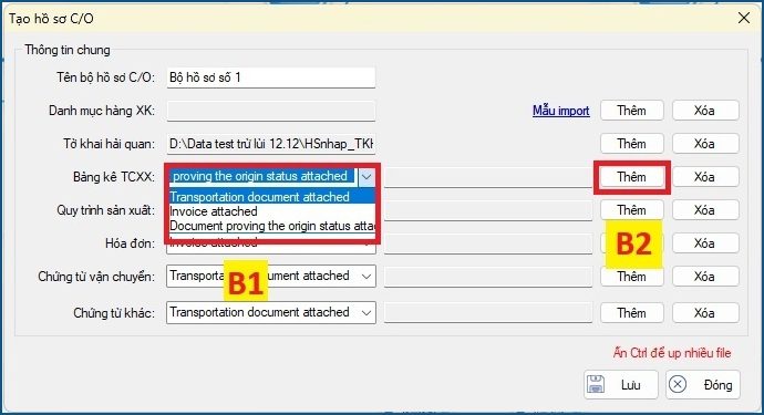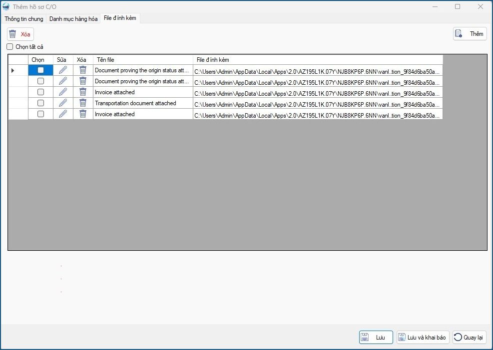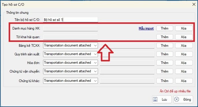 • Các mục còn lại: Doanh nghiệp chọn loại file (Transportation, Invoice, Document) sau đó chọn “Thêm” để đính kèm file tương ứng, có thể chọn nhiều file bằng cách giữ phím Ctrl. Việc chọn thêm loại file giúp đính kèm chính xác file khi gửi hồ sơ lên hệ thống kê khai C/O.