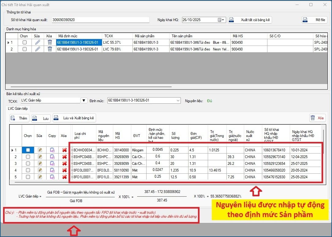 • Trường hợp tờ khai không đủ nguyên liệu, Phần mềm tự động phân bổ từ các tờ khai nhập kế tiếp cho đến khi đủ số lượng.