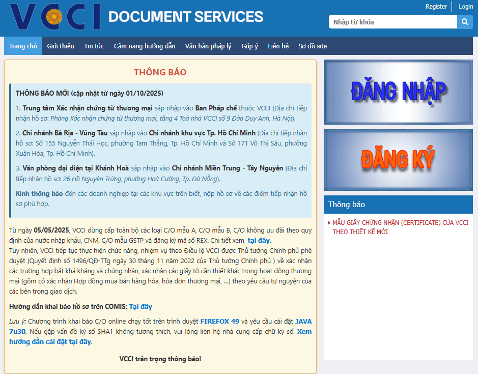 1. Trung tâm Xác nhận chứng từ thương mại sáp nhập vào Ban Pháp chế thuộc VCCI (Địa chỉ tiếp nhận hồ sơ: Phòng Xác nhận chứng từ thương mại, tầng 4 Toà nhà VCCI số 9 Đào Duy Anh, Hà Nội ).